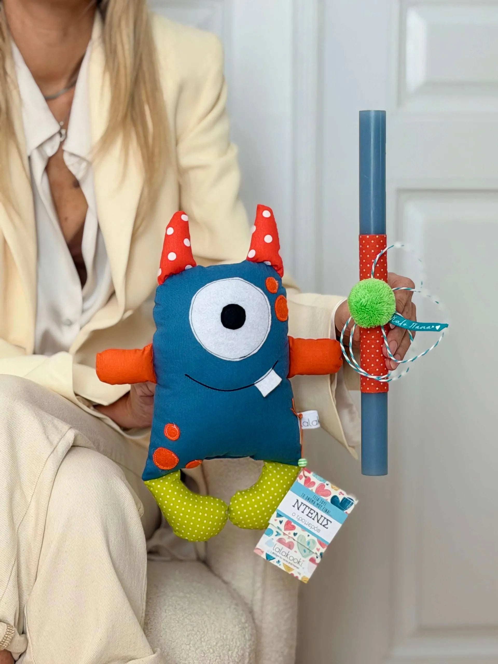 Πασχαλινή λαμπάδα με χειροποίητο υφασμάτινο τερατάκι, ραμμένο με βαμβακερά υφάσματα.