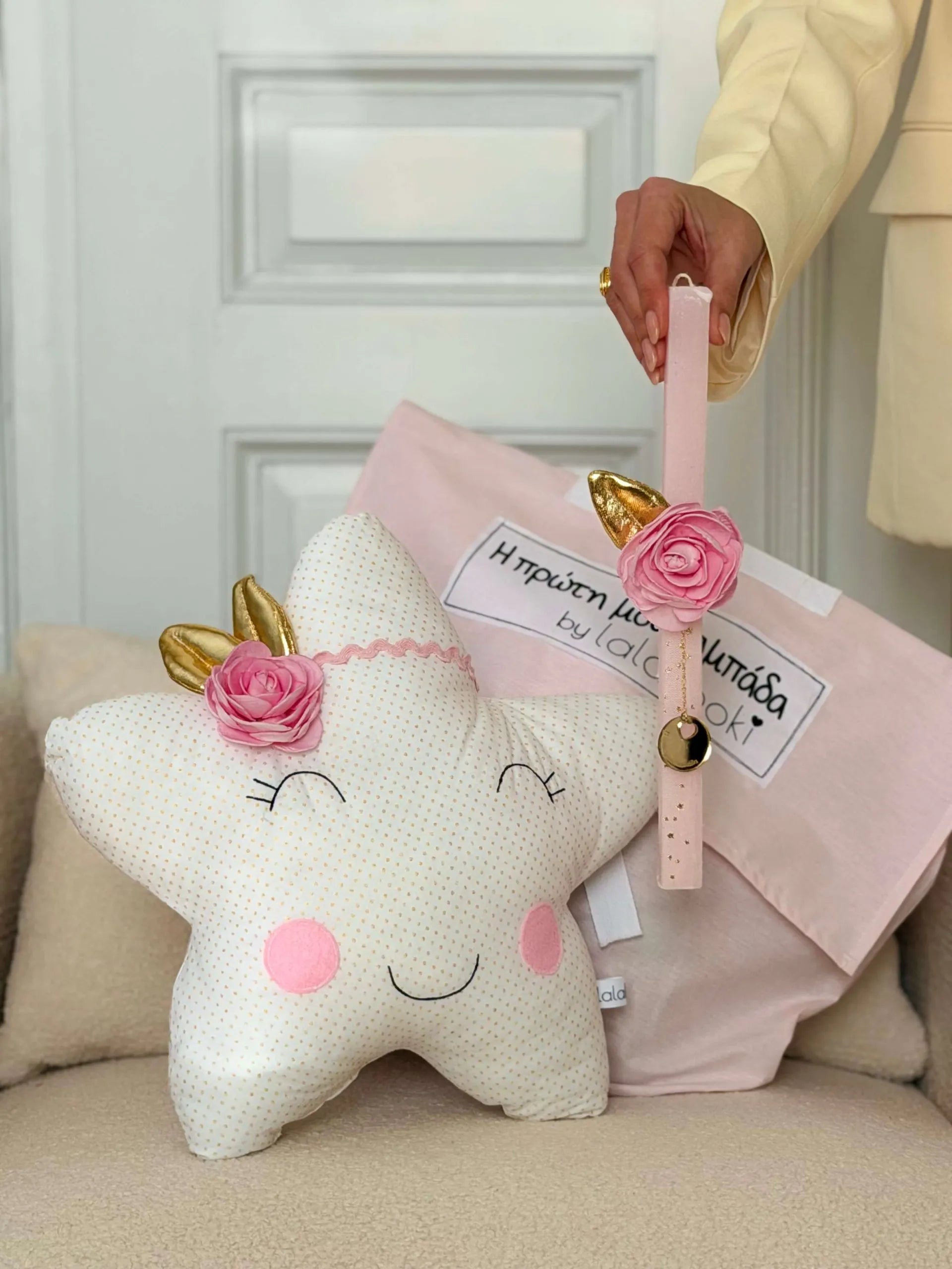 Ενα μαξιλάρι αστέρι στολισμένο με τα ίδια στοιχεία που θα παραμείνει στο παιδικό δωμάτιο σαν μια γλυκιά ανάμνηση από το Πρώτο Πάσχα.