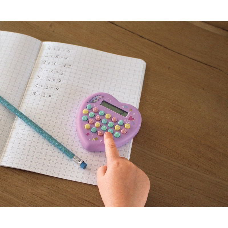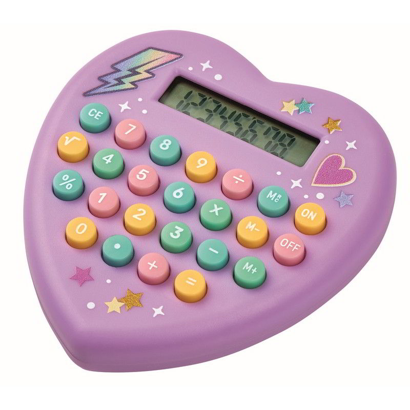 Ο χαριτωμένος υπολογιστής τσέπης σε σχήμα καρδιάς κάνει εύκολους κάθε είδους μικρούς υπολογισμούς για παιδιά και εφήβους, όπου κι αν βρίσκονται. Ο όμορφος σχεδιασμός σε απαλό μωβ ή τιρκουάζ, μαζί με τα μοτίβα αστεριών, αστραπών και καρδιών, τον κάνουν πραγματικό eye-catcher. Ένα ιδιαίτερο highlight είναι και τα πολύχρωμα πλήκτρα αριθμών και συμβόλων. Στην πρακτική μικρή οθόνη φαίνονται καθαρά όλες οι εισαγόμενες πράξεις, ώστε να μην χάνεται ποτέ ο έλεγχος. Ο υπολογιστής λειτουργεί με μπαταρία-κουμπί, η οποία περιλαμβάνεται και μπορεί να αντικατασταθεί όταν χρειαστεί. Αυτός ο υπολογιστής-καρδιά δεν πρέπει να λείπει από καμία σχολική τσάντα και είναι απαραίτητος για κάθε γραφείο!