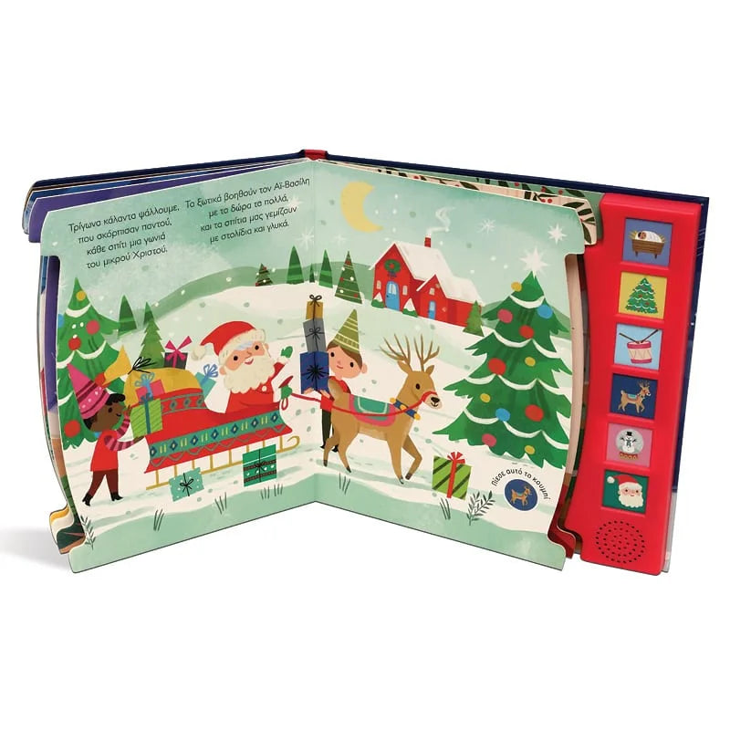 Πατήστε τα κουμπάκια και ακούστε 6 αγαπημένες χριστουγεννιάτικες μελωδίες σε αυτό το γιορτινό βιβλίο με τις όμορφες εικόνες και τα ρυθμικά στιχάκια.