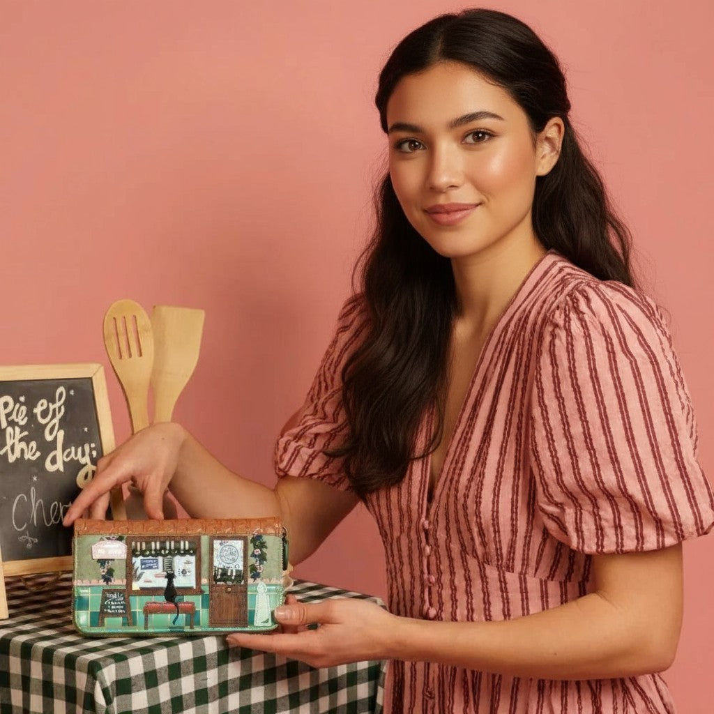 Εμπνευσμένο από τη λαχταριστή σειρά Pie Shop, αυτό το πορτοφόλι είναι ένα πραγματικό κομψοτέχνημα που συνδυάζει λειτουργικότητα και δημιουργικότητα.