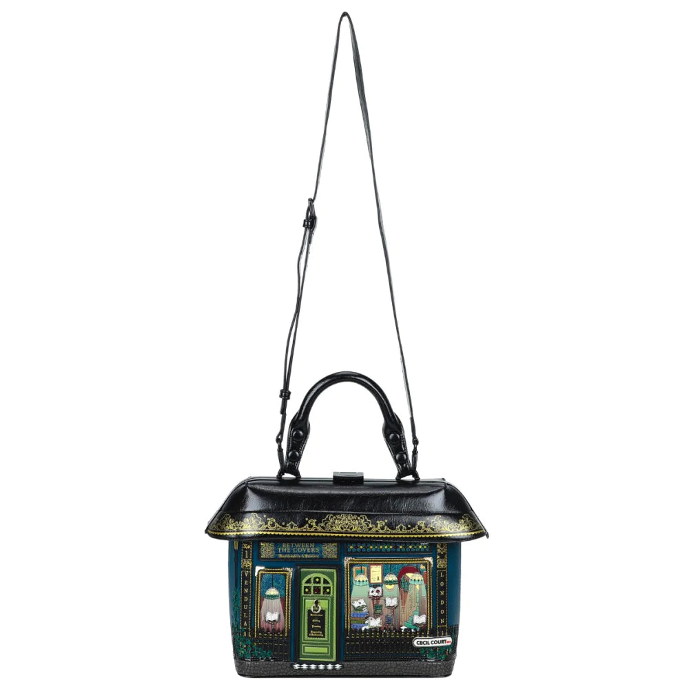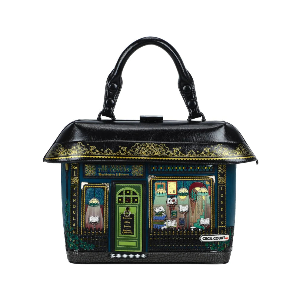 Η μπροστινή της όψη, με printed & απλικέ σχέδιο που απεικονίζει μια γραφική πρόσοψη βιβλιοδετείου, χρυσές foil λεπτομέρειες και κεντημένα μοτίβα, είναι απλώς μαγευτική.