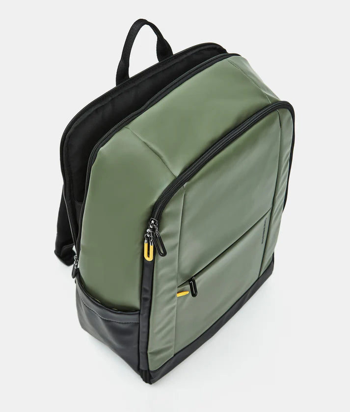 Η συλλογή ECO COATED της Mandarina Duck εκφράζει ένα νεανικό, casual και unisex ύφος, συνδυάζοντας στυλ με οικολογική συνείδηση. Το Travel Backpack είναι κατασκευασμένο από 100% ανακυκλωμένο πολυεστέρα, προερχόμενο από την ανακύκλωση πλαστικών μπουκαλιών (PET), ισοδύναμο με 19 φιάλες των 0,5L. Ανθεκτικό, αδιάβροχο και λειτουργικό, διαθέτει διπλή θήκη, έξυπνα οργανωμένους χώρους και εργονομικούς ιμάντες για άνεση σε κάθε διαδρομή. Ιδανικό για ταξίδια, καθώς χωράει laptop έως 17’’ και διαθέτει λουράκι για εύκολη τοποθέτηση σε τρόλεϊ.
