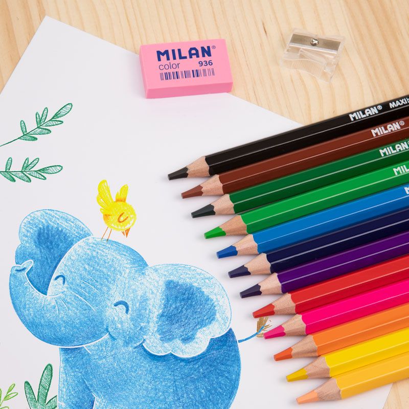MAXI εξαγωνικές ξυλομπογιές. Μύτη διαμέτρου 5 mm. Το μεγάλο μέγεθος (MAXI) είναι ιδανικό για παιδιά. Η μύτη προσφέρει ομοιόμορφη γραφή και είναι ανθεκτική στο σπάσιμο, χάρη στο σύστημα προστασίας μύτης (Lead Protection System - LPS), που την ενισχύει μέσω της σύνδεσής της με το ξύλο. Το ξύλο προέρχεται από βιώσιμα δάση. Περιλαμβάνει 12 χρώματα, το καθένα με το δικό του όνομα. Στη συσκευασία περιλαμβάνονται εσωτερικός δίσκος και ξύστρα MAXI.