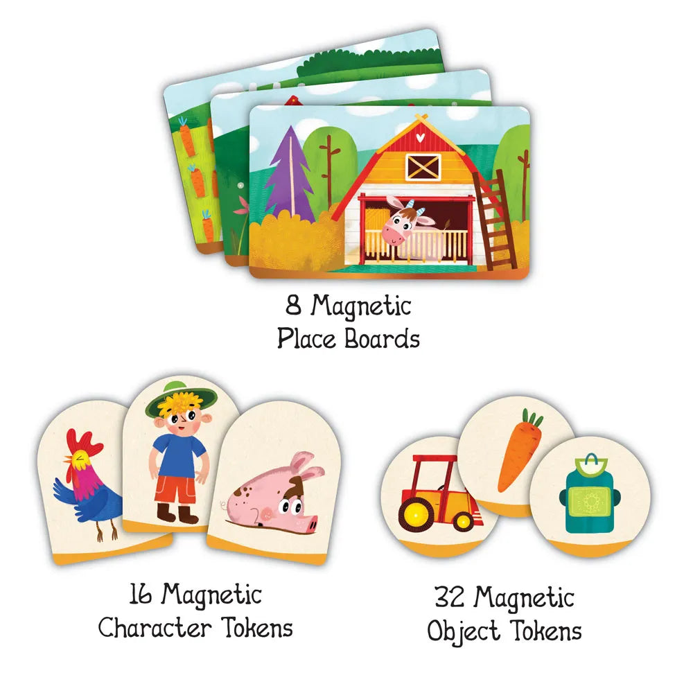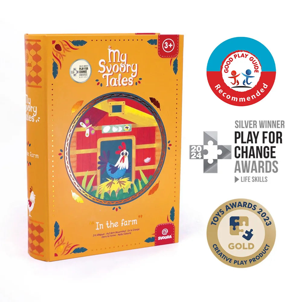 Το “My SvooryTales” της εταιρείας Svoora δεν είναι απλώς ένα παιχνίδι, είναι μια πύλη στη μαγεία της αφήγησης! Βραβευμένο με το Silver Award στα Play for Change Awards 2024 (κατηγορία Life Skills) και το Χρυσό Βραβείο στα Toys Awards 2023 (κατηγορία Educational Toys), το παιχνίδι αυτό συνδυάζει δημιουργικότητα, εκπαίδευση και διασκέδαση, ακολουθώντας τη σχεδιαστική δομή ενός παραδοσιακού vintage βιβλίου. Με 8 τοποθεσίες, 16 χαρακτήρες και 32 αντικείμενα σε μαγνητικά στοιχεία, τα παιδιά μπορούν να δημιουργούν αμέτρητες ιστορίες με εναλλακτικά φινάλε – κάθε φορά και μια νέα περιπέτεια! Το θέμα της φάρμας είναι ιδιαίτερα προσφιλές και αγαπητό στα νήπια προσχολικής ηλικίας, αφού φέρνει στη ζωή γνώριμες εικόνες και χαρακτήρες που τα παιδιά λατρεύουν να εξερευνούν. Στο εσωτερικό του υπάρχουν 3 σελίδες οι οποίες αντιστοιχούν στα 3 στάδια αφήγησης: Εισαγωγή, Προϊδέαση-Διήγηση και Λύση. Περιλαμβάνει επίσης μαρκαδόρο γράψε-σβήσε, για να γράφετε ονόματα, χαρακτηριστικά και ιδιότητες πάνω στις σελίδες. Διαθέσιμο σε 5 διαφορετικά θέματα και με μοναδικό ρετρό σχεδιασμό, το “My SvooryTales” είναι το απόλυτο εργαλείο για γονείς, εκπαιδευτικούς και θεραπευτές, που θέλουν να ενισχύσουν τη φαντασία, τη γραφή, και τη συναισθηματική ανάπτυξη των παιδιών τους, ενώ παράλληλα προσφέρει στιγμές ποιοτικού οικογενειακού χρόνου. Δώστε στα παιδιά σας τη χαρά να γράψουν τη δική τους ιστορία – γιατί η καλύτερη ιστορία για την καληνύχτα είναι αυτή που δημιουργούν τα ίδια!