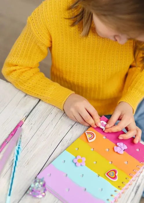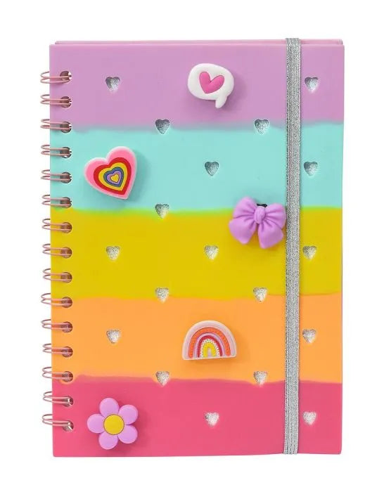 Αυτό το πολύχρωμο σημειωματάριο είναι πραγματικά εντυπωσιακό επάνω στο γραφείο. Το ανάγλυφο εξώφυλλο σε χρώματα ουράνιου τόξου είναι διακοσμημένο με μικρές καρδιές-αποκοπές και διαθέτει χώρο για πέντε πολύχρωμα σιλικονούχα charms, τα οποία μπορούν να τοποθετηθούν και να αλλάξουν θέση εύκολα, ανάλογα με τη διάθεση.