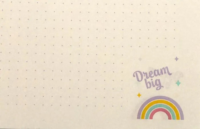 Στο εσωτερικό του θα βρείτε 160 σελίδες με τελείες, έτοιμες να γεμίσουν με ιδέες, σκίτσα ή σημειώσεις – ιδανικό για το σχολείο, την καθημερινότητα ή δημιουργικά έργα. Ένα ελαστικό λαστιχάκι με γκλίτερ κρατά το σημειωματάριο ασφαλώς κλειστό.