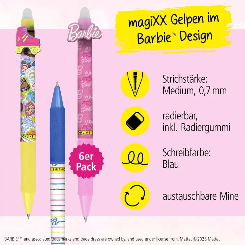 Τα ONLINE magiXX – Barbie Erasable Gel Pens κάνουν τη γραφή διασκεδαστική και χωρίς άγχος! Ιδανικά για το σχολείο ή τη δημιουργική γραφή, αυτά τα μαγικά στυλό γέλης σβήνουν εύκολα και καθαρά – χωρίς μουτζούρες και χωρίς διορθωτικό! Ξέχνα τα διαγραμμένα τετράδια και απόλαυσε καθαρή, προσεγμένη γραφή.