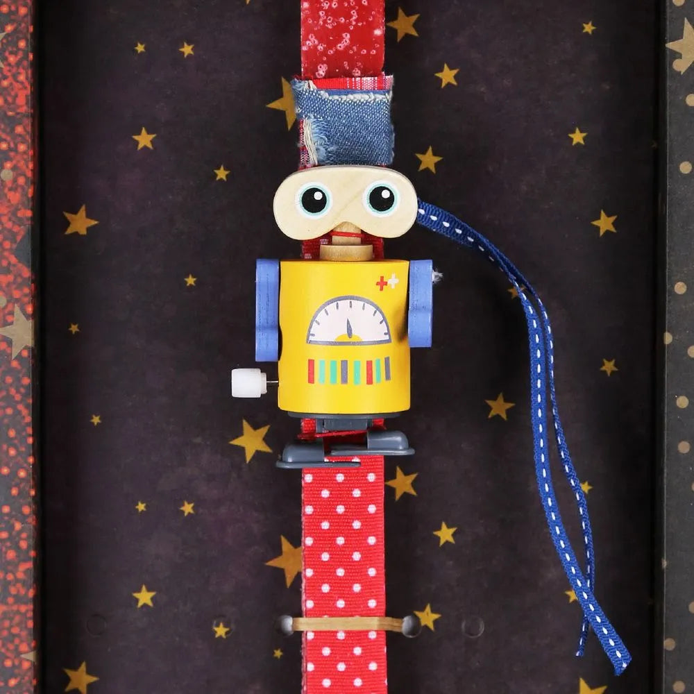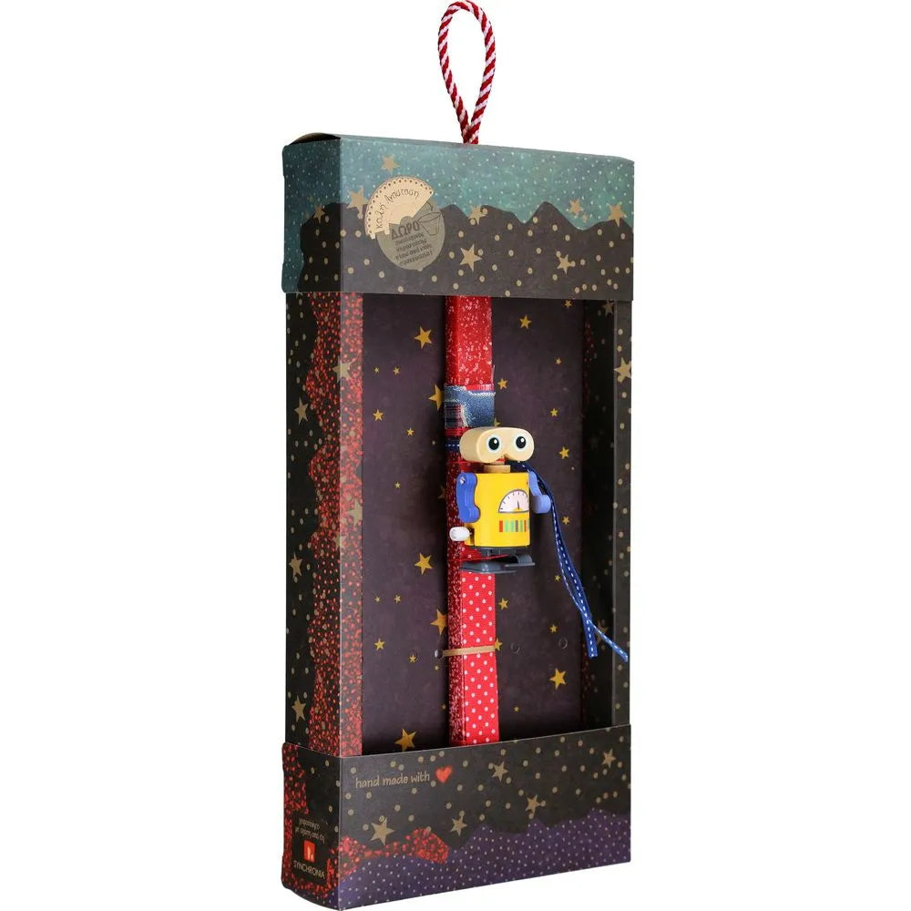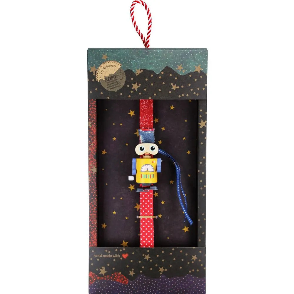 Μια πασχαλινή λαμπάδα που φέρνει τη μαγεία των vintage παιχνιδιών στο σήμερα. Το ξύλινο κουρδιστό ρομποτάκι κινείται και περπατά, χαρίζοντας χαμόγελα και ενθουσιασμό. Ιδανική για μικρά αγόρια, βαφτιστήρια και παιδιά που αγαπούν τα ρετρό παιχνίδια με χαρακτήρα. Διατίθεται σε διαφορετικούς χρωματικούς συνδυασμούς ώστε κάθε παιδί να βρει το αγαπημένο του. Κατασκευασμένη χειροποίητα με ποιοτικά υλικά και προσεγμένη λεπτομέρεια από την ομάδα της Synchronia, συνοδεύεται από οικολογική συσκευασία δώρου υψηλής αισθητικής.