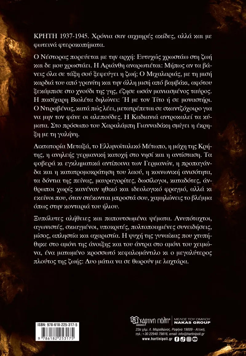 Δικτατορία Μεταξά, το Ελληνοϊταλικό Μέτωπο, η μάχη της Κρήτης, η ανηλεής γερμανική κατοχή στο νησί και η αντίσταση. Τα φοβερά κι εγκληματικά αντίποινα των Γερμανών, η προπαγάνδα και η κατατρομοκράτηση του λαού, η κοινωνική ανισότητα, τα δόντια της πείνας, μαυραγορίτες, δωσίλογοι, καταδότες, άνθρωποι χωρίς κανέναν ηθικό και ιδεολογικό φραγμό, αλλά κι εκείνοι που, όταν στέκονται μπροστά σου, χαμηλώνεις το βλέμμα όπως στην κονταριά του ήλιου.