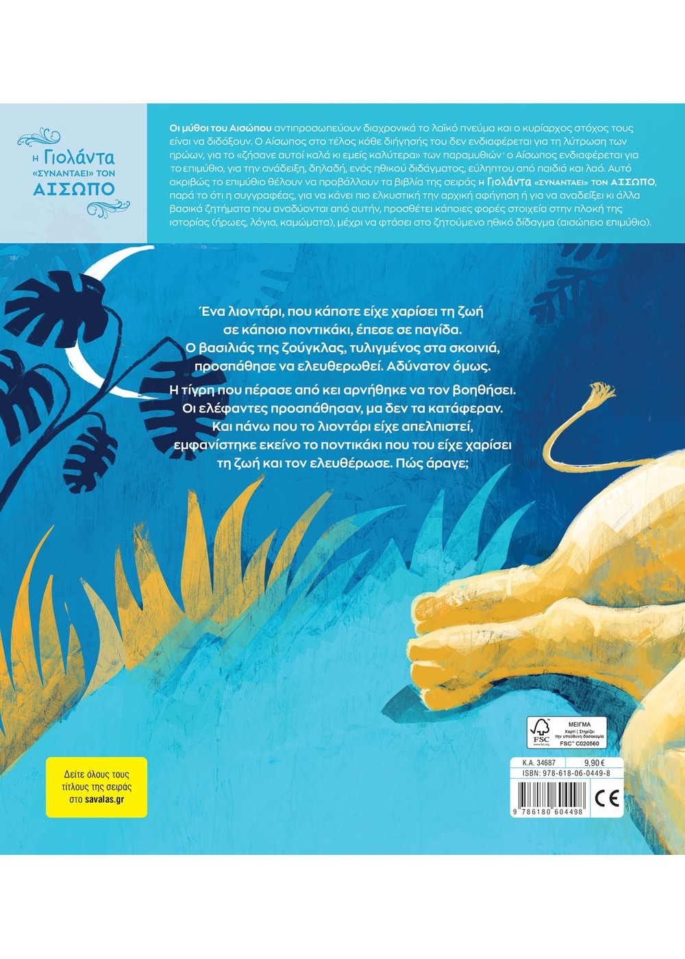 Ένα λιοντάρι, που κάποτε είχε χαρίσει τη ζωή σε κάποιο ποντικάκι, έπεσε σε παγίδα. Ο βασιλιάς της ζούγκλας, τυλιγμένος στα σκοινιά, προσπάθησε να ελευθερωθεί. Αδύνατον όμως. Η τίγρη που πέρασε από κει αρνήθηκε να το βοηθήσει. Οι ελέφαντες προσπάθησαν, μα δεν τα κατάφεραν. Και πάνω που το λιοντάρι είχε απελπιστεί, εμφανίστηκε εκείνο το ποντικάκι που του είχε χαρίσει τη ζωή και τον ελευθέρωσε. Πώς άραγε;