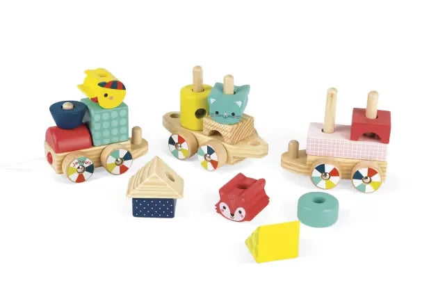 2 παιχνίδια σε 1: ένα ξύλινο τρένο που αποτελείται από 3 βαγόνια για να αναπτύξει τη φαντασία του παιδιού σας και ένα παιχνίδι που θα τραβάει, εξασκώντας τις κινητικές του δεξιότητες. Αποτελείται από 14 χρωματιστά τούβλα διαφόρων γεωμετρικών σχημάτων, για να βοηθήσουν το μωρό σας να μάθει τα χρώματα και να κάνει τις πρώτες του κατασκευές. Ξύλλο: κινεζική κερασιά (βαμμένα μέρη) και ξύλο πεύκου (φυσικά μέρη). Εκτύπωση: θερμοτυπία. Κλειστό χρωματιστό κουτί.