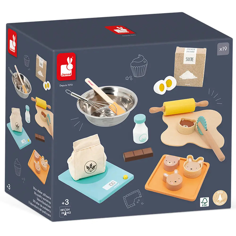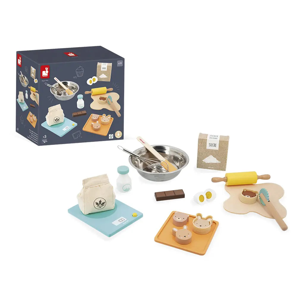 Ώρα να φτιάξουμε κολατσιό! Αυτό το σετ ψησίματος θα δώσει τη δυνατότητα στο παιδί σας να γίνει ένας πραγματικός αληθινός σεφ! Για να φτιάξετε ωραία κέικ, χρειάζεστε: ένα αυγό, λίγη σοκολάτα, λίγη ζάχαρη, λίγο γάλα και λίγο αλεύρι, καθώς και 2 φόρμες σε σχήμα κουνελιού και αρκούδας. Απολαύστε εξαίσια γλυκά σερβιρισμένα σ’ έναν δίσκο. 19 αξεσουάρ που είναι ιδανικά για να μαγειρέψετε σαν τους μεγάλους. Αυτό το σετ είναι ιδανικό για την ανάπτυξη της φαντασίας των παιδιών. Παιχνίδι από χαρτόνι κατασκευασμένο με τις προδιαγραφές του Συμβουλίου Διαχείρισης των Δασών (FSCTM). Για παιδιά ηλικίας από 3 ετών και άνω.