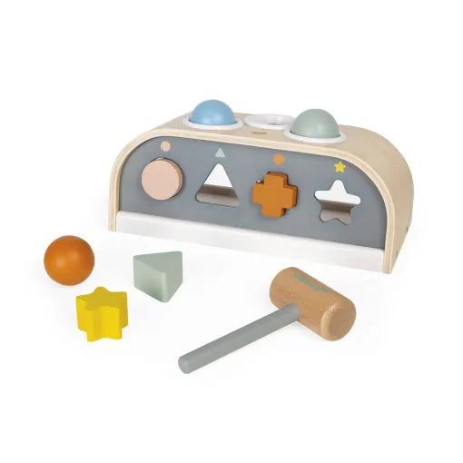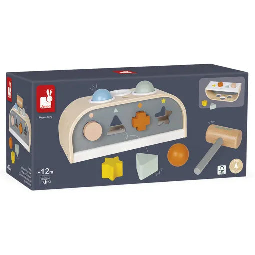 Ξύλινο παιχνίδι για παιδιά ηλικίας 12 έως 36 μηνών. Ένα παιχνίδι επιδεξιότητας που βοηθά τα παιδιά να αναπτύξουν ευκινησία και συντονισμό ενώ διασκεδάζουν. 3 δραστηριότητες σε 1: χτυπήστε τα μπαλάκια με το σφυρί, αναγνωρίστε τα 4 διαφορετικά σχήματα και μάθετε τα χρώματα μέσω του παιχνιδιού εφαρμογής σχημάτων και ενός κουτιού με σχήματα.