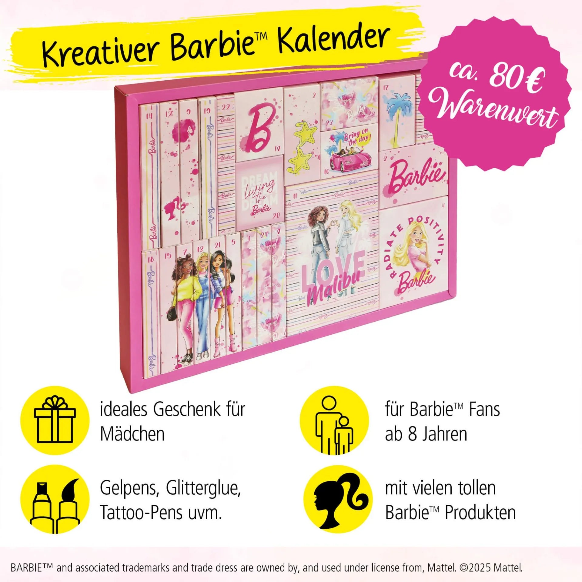 Το αποκλειστικό παιδικό ημερολόγιο της ONLINE (52 x 40,5 x 5,5 cm) για ηλικίες 12+ περιέχει όλα όσα χρειάζεται μια δημιουργική λάτρης της Barbie για να φτιάξει και να παίξει με φαντασία. Οι 25 ατομικά συσκευασμένες εκπλήξεις φωτίζουν και τις πιο σκοτεινές μέρες του χειμώνα και έχουν συνολική αξία άνω των 80 €.