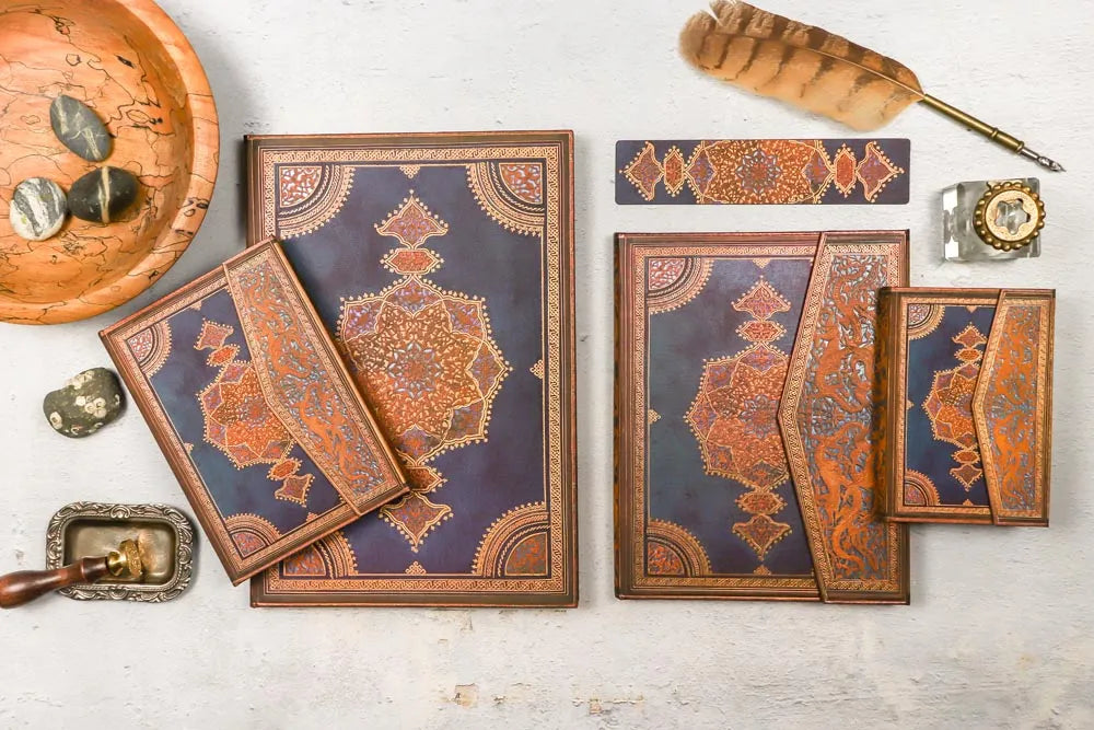 Το Safavid Indigo αντλεί έμπνευση από την εκλεπτυσμένη αισθητική της Περσικής Σαφαβιδικής περιόδου — μιας εποχής όπου η τέχνη της βιβλιοδεσίας έφτασε στο απόγειό της. Το σχέδιο αναπαράγει ένα δερμάτινο μοτίβο φιλιγκράν με χειροποίητα ανάγλυφα σχέδια, διατηρώντας τη συμμετρία και τη χάρη που χαρακτήριζαν τη Χρυσή Εποχή της Ισλαμικής Τέχνης.