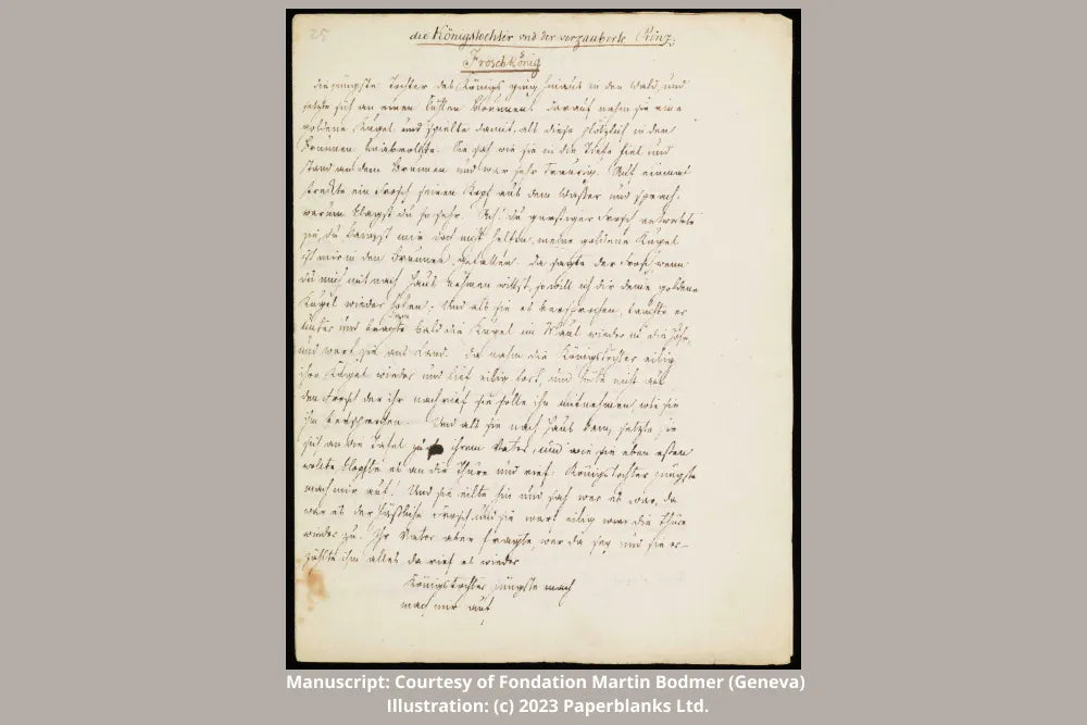Με σεβασμό προς αυτήν τη σπουδαία κληρονομιά, η Paperblanks αναπαράγει το αυθεντικό χειρόγραφο του “The Frog Prince” από τη Συλλογή της Bodmer Foundation, ως το πρώτο τεύχος της σειράς Fairy Tale Collection — μια γιορτή της μαγείας, της γλώσσας και της φαντασίας.