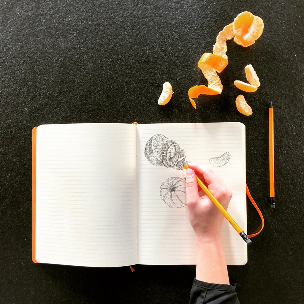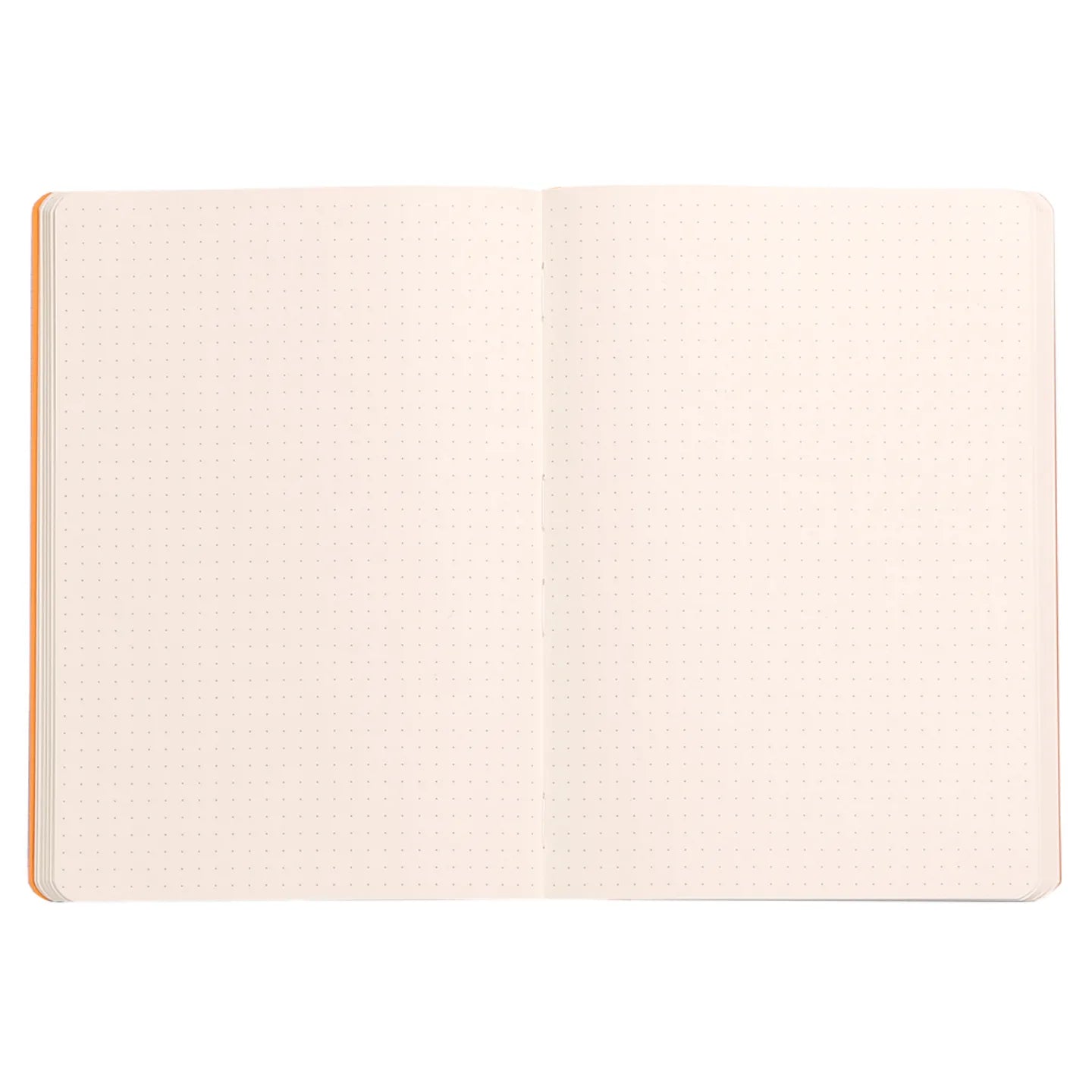 Διαθέτει πορτοκαλί ελαστικό κλείσιμο, 80 φύλλα από χαρτί 90 gsm σε χρώμα ελεφαντόδοντου με απαλή βελούδινη υφή (ivory brushed vellum paper), πορτοκαλί σελιδοδείκτη κορδέλα, πορτοκαλί επεκτεινόμενη εσωτερική τσέπη, καθώς και εμπρόσθιες και οπίσθιες σελίδες ίδιου χρώματος.