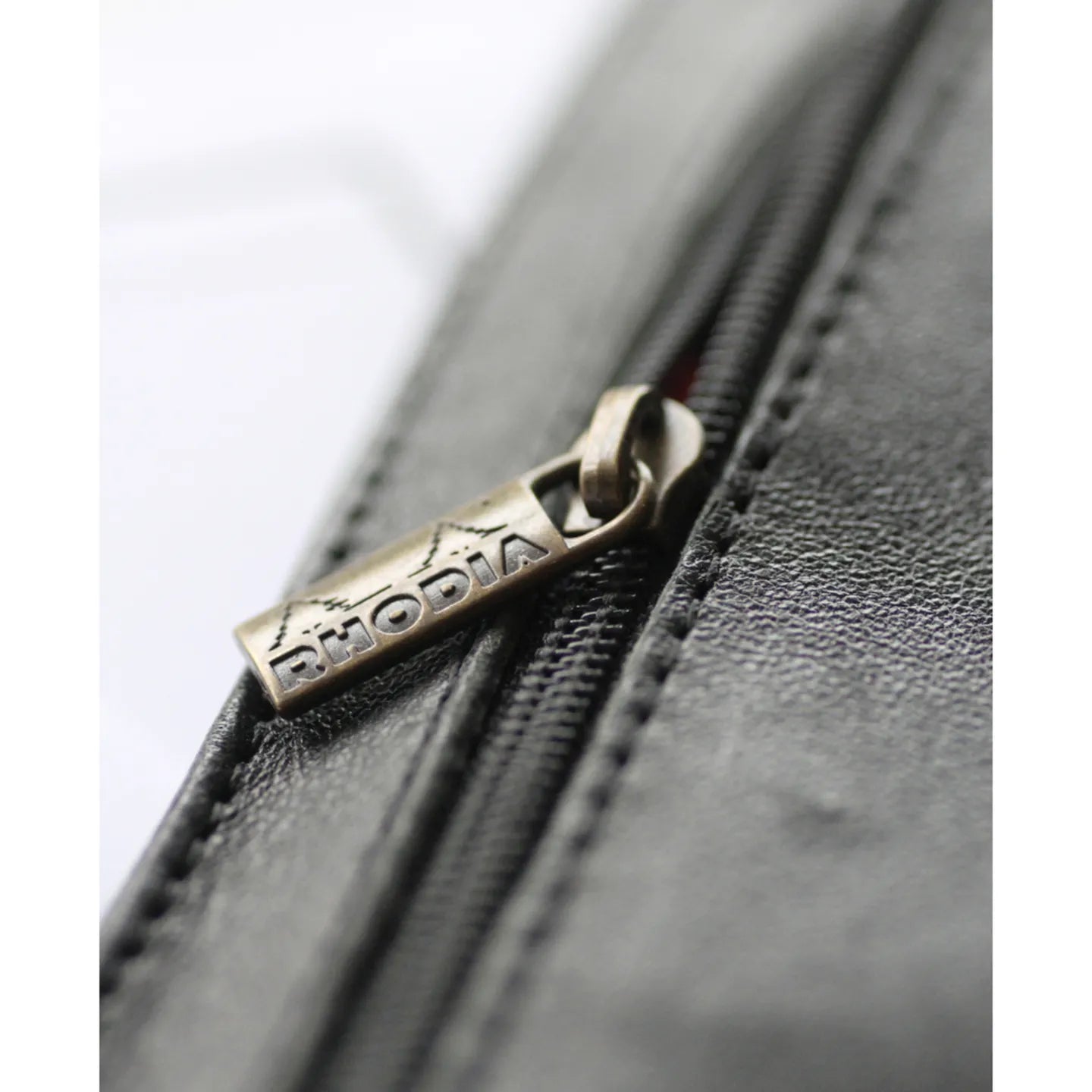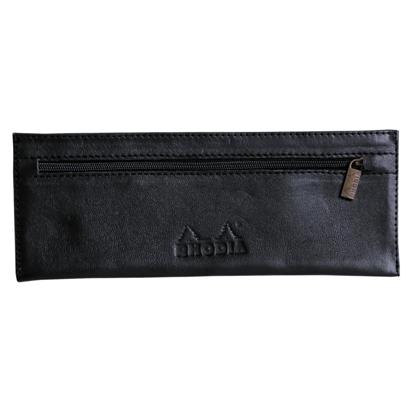 Κομψή θήκη για στυλό και μολύβια από μαύρο γνήσιο δέρμα, με μεταλλικό φερμουάρ για εύκολο άνοιγμα και κλείσιμο. Το ανάγλυφο λογότυπο Rhodia προσδίδει διακριτική πολυτέλεια και υψηλή αισθητική.