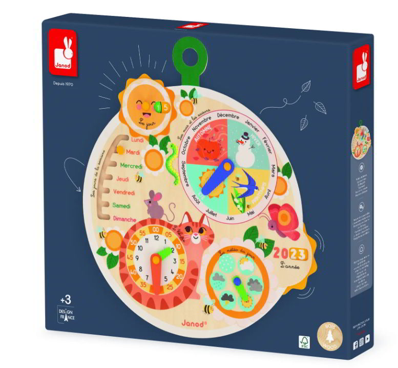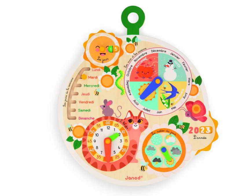 Ένας ήλιος γυρίζει για να δείξει την ημερομηνία, ένα βελάκι-δρομέας βοηθά το παιδί σας να μάθει τις μέρες της εβδομάδας, ένα ρολόι με 2 χρωματισμούς δείκτες το μαθαίνει να διακρίνει τις ώρες από τα λεπτά, ένας δείκτης του καιρού το μαθαίνει να ντύνεται μόνο του και, τέλος, ένας άλλος δείκτης το βοηθά να κατανοήσει τις εποχές και τους μήνες. Ο τροχός του χρόνου έχει κι έναν μικρότερο τροχό, που διατρέχει τα χρόνια για ένα διάστημα 10 ετών: 5 χρόνια στη μία πλευρά και 5 στην άλλη.