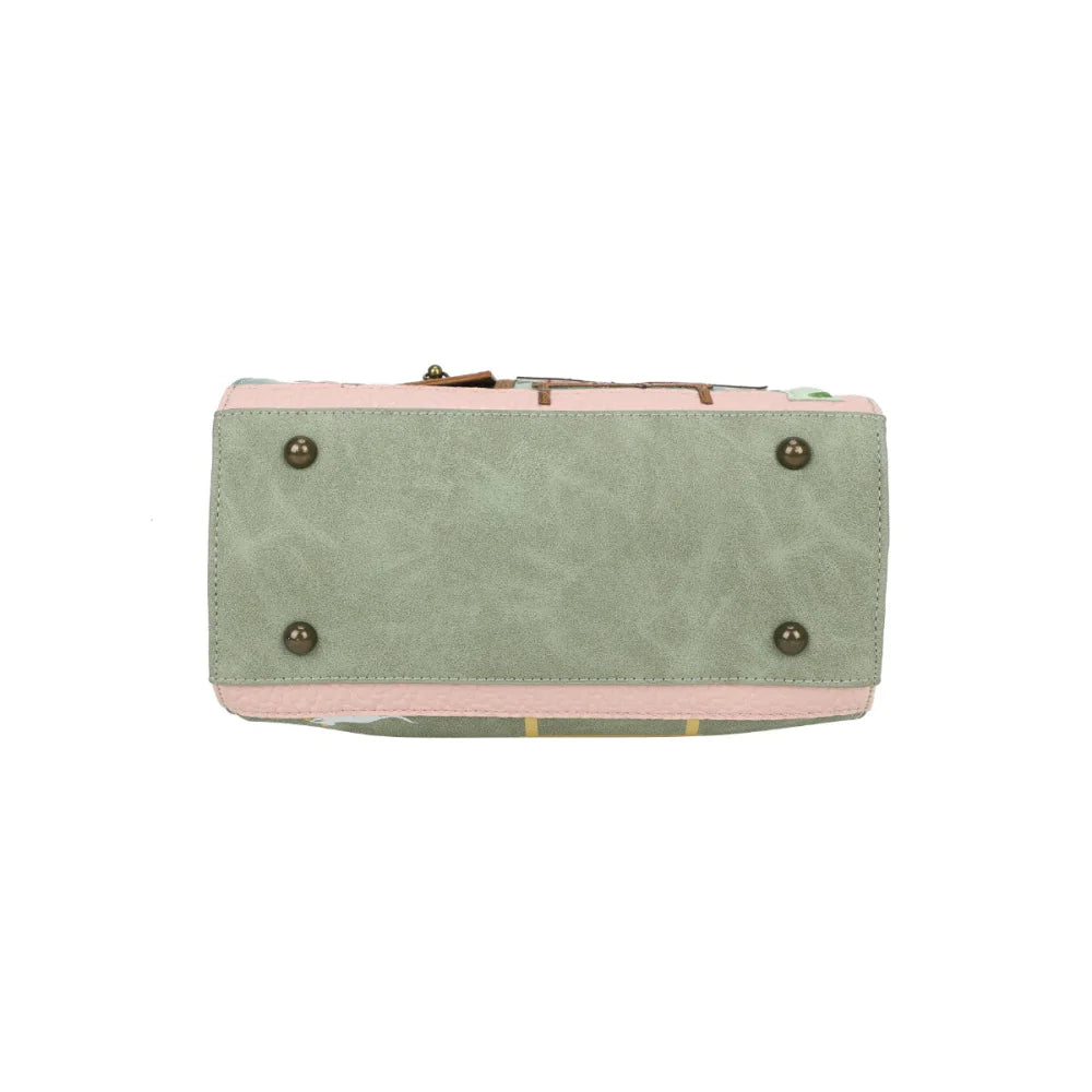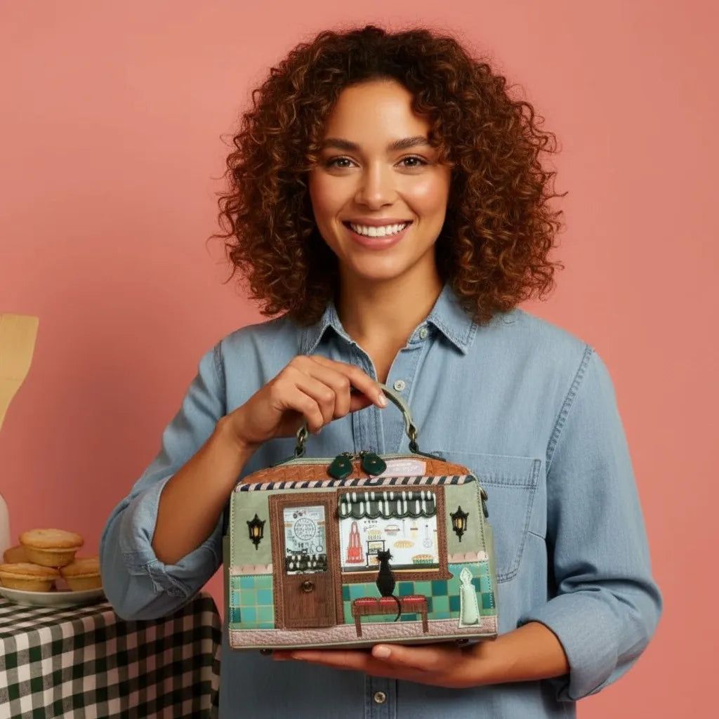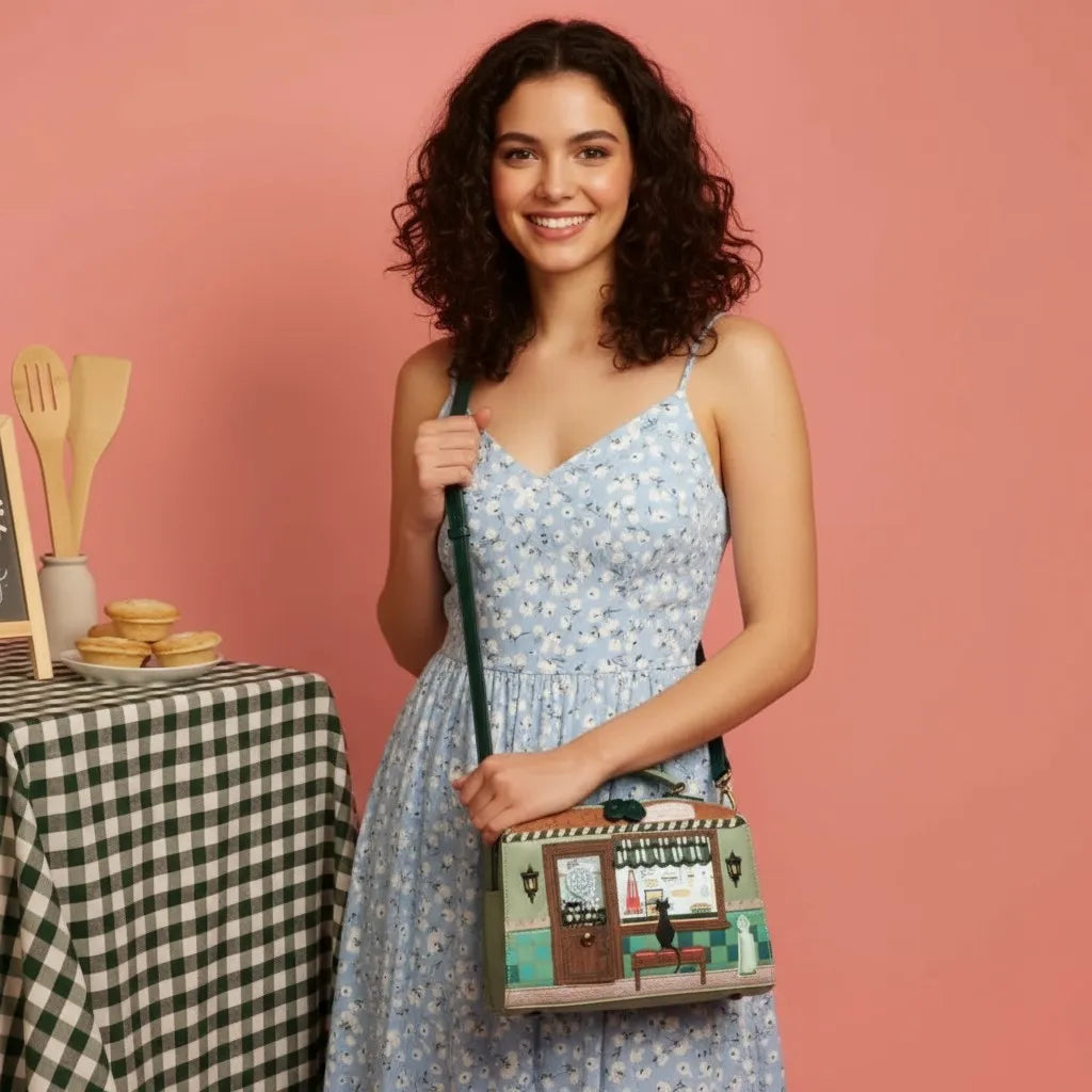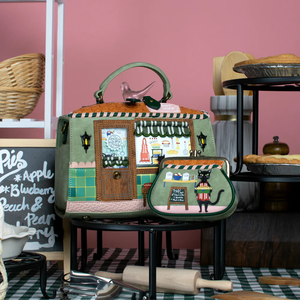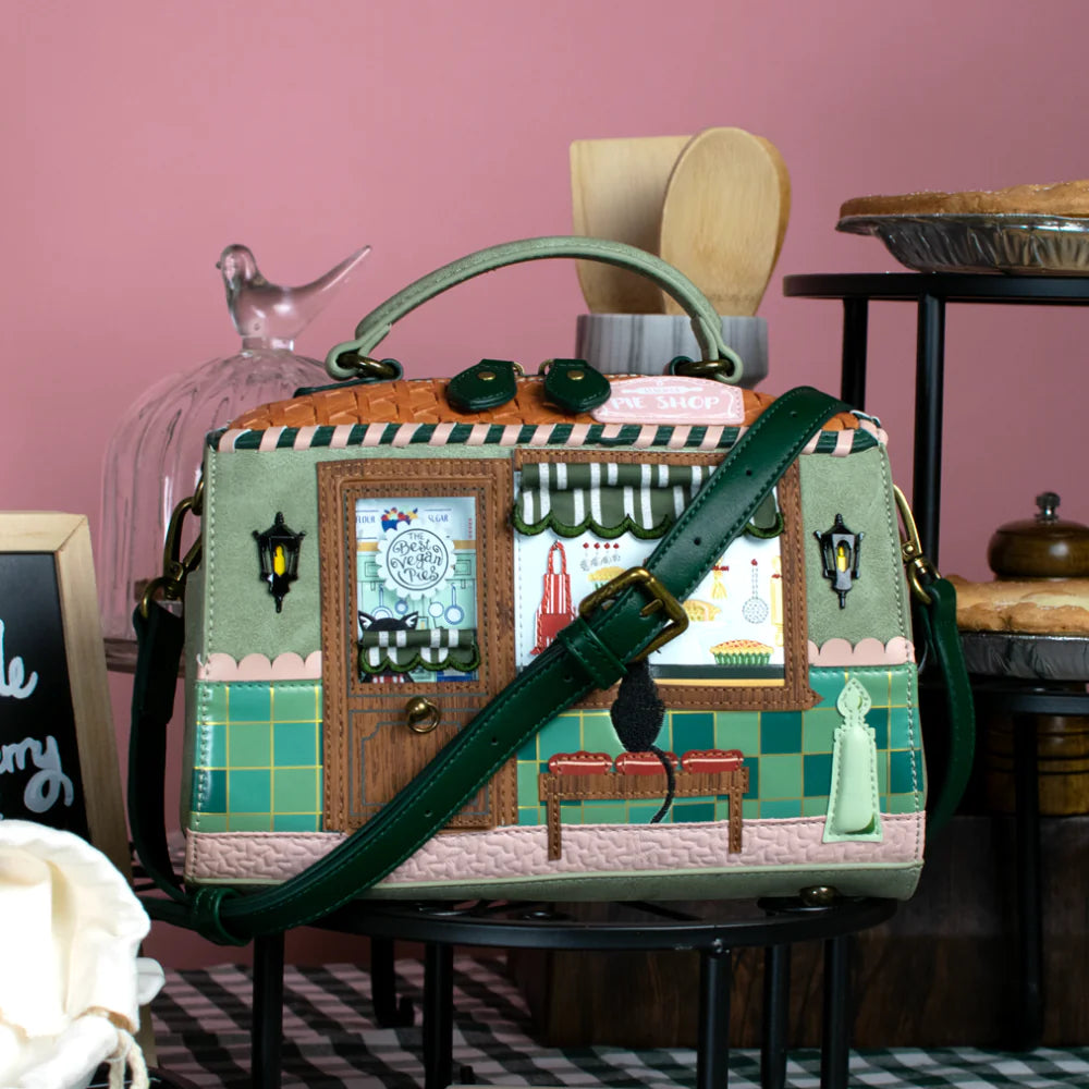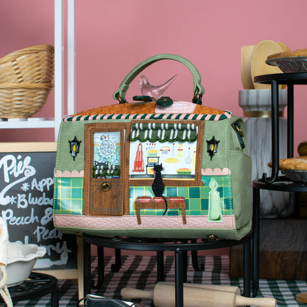 Εμπνευσμένη από το γοητευτικό πνεύμα των βρετανικών αρτοποιείων, η τσάντα απεικονίζει μια ζεστή βιτρίνα με λαχταριστές πίτες και ροζ ταμπέλα, σε έναν υπέροχο πράσινο τόνο vegan δέρματος.